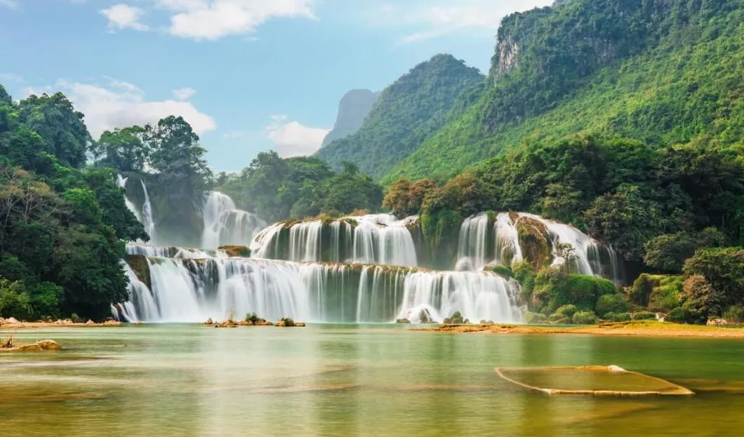 Detian Cross-Country Waterfall is located in Detian, Shuo Long Town, Daxin County, Chongzuo City, Guangxi Province. It is situated in the upper reaches of the Quichun River, at the border between China and Vietnam. The Detian Waterfall is a spectacular natural wonder connected with the neighboring Banyao Waterfall in Vietnam. It is the first in Asia and the fourth-largest transnational waterfall globally. The average annual water flow is about three times that of the Huangguoshu Waterfall in Guizhou. The scenic area includes popular tourist attractions such as Detian Pagoda, Boundary River Rafting, Copper Drum Square, Sino-Vietnamese Style Street, Sino-Vietnamese Cross-Border Street, and other Netflix hit projects.