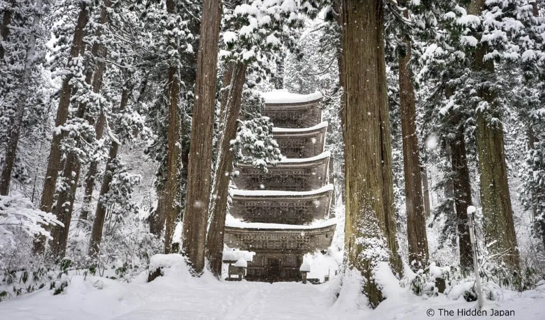 Put on a pair of snowshoes, grab some ski poles and make your way through a dense cedar forest into one of the most spiritual places in Shonai. After a short hike, you’ll reach Suga Waterfall, under which aesthetics would sit under as part of their spiritual practice. A little further on, you’ll find the imposing Jiji-sugi (grandfather cedar tree), an old cedar tree purported to be over 1,000 years old. Finally, you’ll see a stunning structure of architectural brilliance — the Mount Haguro Five-story Pagoda — covered in a crown of snow. This 29m-high five-story pagoda was built over 600 years ago and has stood the test of time through earthquakes and annual heavy snowfall. It is made entirely of wood and remains unpainted, offering beauty in its simplicity, decorated only by layers of pure white snow.