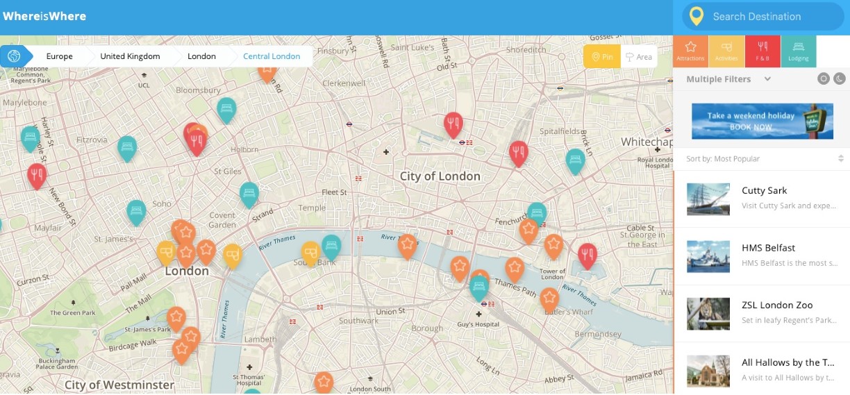 Mid-2016 will see WhereIsWhere launch to travellers, offering them the latest information from the travel industry, as they explore the world. On our easy-to-use platform, travellers can click on a pin, and open up information about the location, and its marketing content, latest promotions. With WhereIsWhere, travellers get to explore every off-the-beaten-path attraction, sights and places; unlock unique travel experiences!