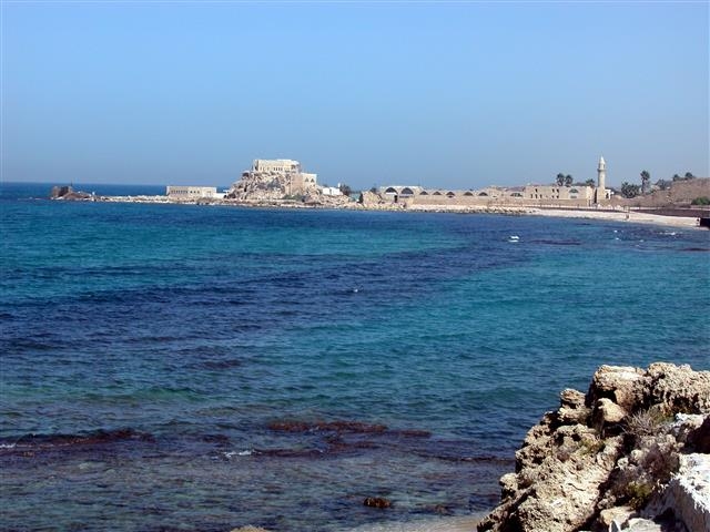 "Along the coast Herod discovered a city that was in decay named Straton's Tower. The stretch of coast-line from Dora to Joppa, between which the city lies, was completely devoid of harbors, so that every ship sailing from Egypt along the coast of Phoenicia had to ride at anchor in open when menaced by southwest wind, for even a moderate breeze from this quarter dashes the wave to such a height against the cliffs that their reflux spread a great commotion far out to sea."