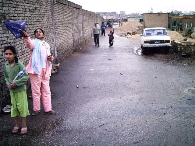 These children live with their parents and other neighbors in an ancient mausoleum cemetery seen in the background. Egyptians who cannot afford regular housing clean out the inside of a mausoleum in the cemetery for housing rather than families sleeping under freeways, bridges, parks, streets, and etc. as in the United States.