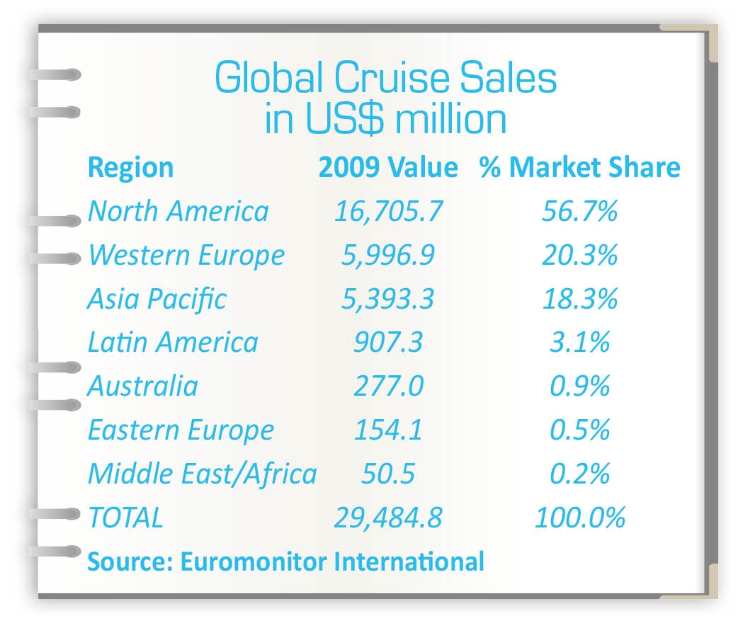 The global cruise industry achieved sales of US$29.5 billion in 2009. North America continued leading value sales followed by Western Europe. Asia Pacific came in third with an 18% value share of the market and enormous potential for growth.