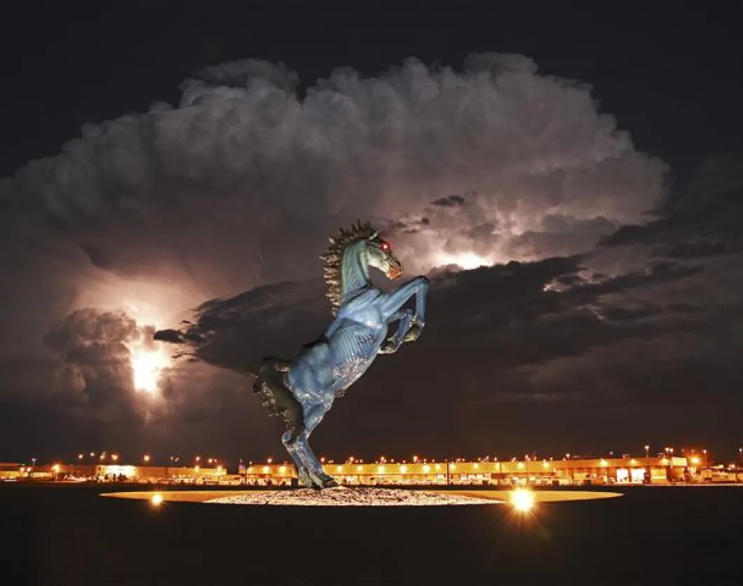 Murals punctuate open spaces throughout Jeppesen Terminal; 5,280 tiny propellers – one propeller for each foot of altitude that gives the “Mile-High City” its name – populate a wall in the train tunnels connecting the terminal and concourses, activated by the movement of the trains to cast a shimmering wall of light down the tracks; a rearing blue stallion, Mustang by Luis Jiménez, expresses the energy and momentum of the West with red eyes unapologetically looking to the future. It is this fusion of art and architecture that makes Denver International Airport unique among the nation’s airports and the public art program unique among the nation’s public art programs.
