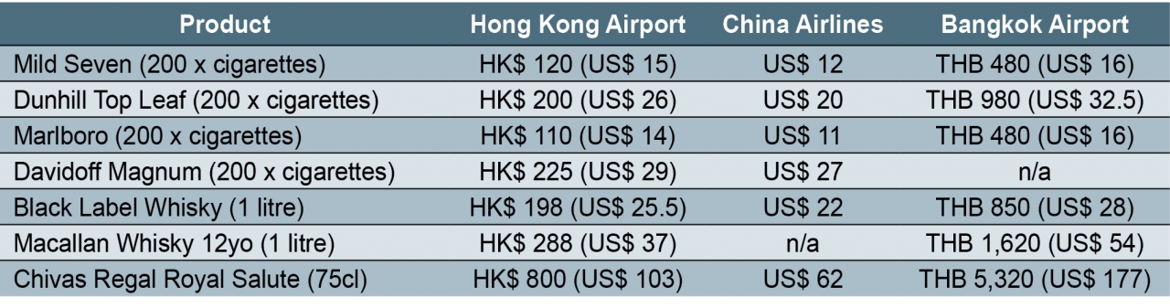 Don't believe us? Well, let us give you an idea of what you could save on a trip from Hong Kong to Bangkok. We have listed a few regular items with the prices at Hong Kong International Airport, China Airlines inflight Duty Free and the arrival Duty Free at Bangkok International Airport. Please note that the below prices are no longer valid but they still give you an example of what the price differences can be.
