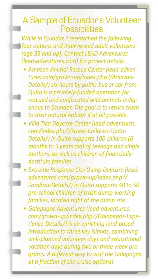 Better yet is to discover organizations that make all living and working arrangements, and shepherd volunteers through their chosen experience (including any crisis!) from arrival to departure. I was fortunate to discover Quito-based LEAD Adventures (lead-adventures.com) whose dedicated staff carries out these services year round with a creative menu of well-researched options on the country's mainland and in the Galapagos Islands.