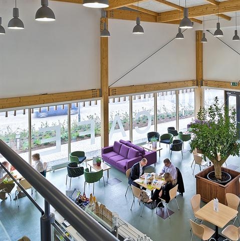 Located at the centre of England in Daventry, it is a well-connected base for any green and forward-thinking business. The building’s low carbon design features include a natural ventilation system and panels in the ceiling that can absorb or emit heat, depending on the temperature. The roof is made of an inflatable plastic membrane, similar to the material used on the Eden project in Cornwall.