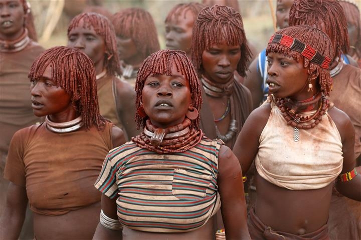 The Hamar and Benna people reside in the far south west region of the Omo Valley, beyond the Mt Buska. They are highly superstitious and until recently very little information about them was known to the outside world. Often referred to as the "Bull-jumping" people they are famous for their bull jumping ceremonies, which are used as a rite of passage from adolescence to adulthood for the male members of the society. The bull-jumping ceremonies also serve as courting, where both men and women decorate themselves in order to win a mate.