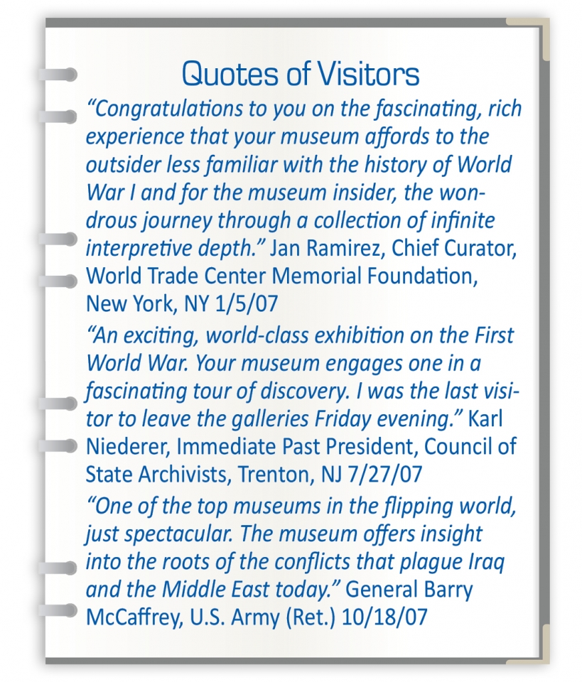 The design for the federally-designated “National World War I Museum” was created with the museum staff and Ralph Appelbaum Associates of New York. The new exhibit space of 32,000 square feet holds the permanent exhibit, “The World War, 1914-1919,” a comprehensive presentation about World War I which was opened to the public on December 1, 2006.