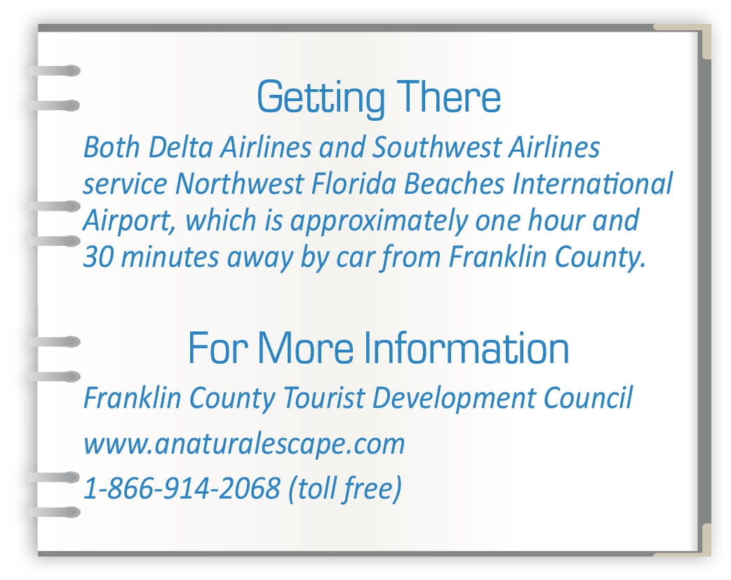 It’s also why the Franklin County Tourist Development Council promotes not only larger tour guides but also small tour operators who serve kayakers, hikers, and birdwatchers in such areas as Tate’s Hell State Forest and Bald Point State Park. The Council has also beefed up promotion of its lodging options in anticipation of tourist interest in its recently-opened LEED-certified Apalachicola National Estuarine Research Reserve which houses both a visitor center and research labs. Accommodations range from houses and condo units, primarily rented through vacation rental companies and local rental agencies, to historic inns, local hotels, bed and breakfast inns as well as RV and campsites.
