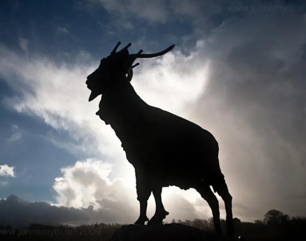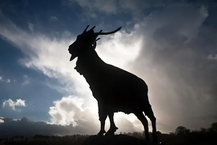 The most widely mentioned story relating to the origin of King Puck, associates him with the English Ironside Leader Oliver Cromwell. It is said that while the Roundheads were pillaging the countryside at the foot of the McGillycuddy Reeks, they routed a herd of goats grazing on the upland. The animals took flight before the raiders, and the he-goat or "Puck" broke away on his own and lost contact with the herd. While the others headed for the mountains he went towards Cill Orglain (Killorglin) on the banks of the Laune. His arrival there in a state of semi exhaustion alerted the inhabitants of the approaching danger and they immediately set about protecting themselves and their stock. It is said that in recognition of the service rendered by the goat, the people decided to institute a special festival in his honour and this festival has been held ever since.
