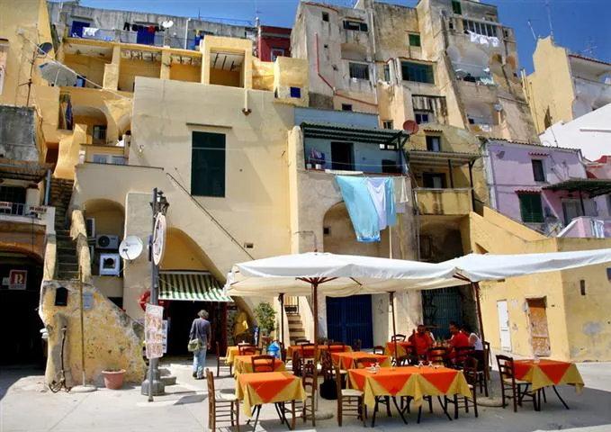 Much of the town centre of ‘Mongibello’, though, can be found on the tiny neighbouring island of Procida. A regular boat service leaves from Ischia Porte, but, if you’re feeling adventurous, you can take a boat taxi and bounce across the waves from Ischia Ponte to the Marina di Chiaiolella, on the island’s southern coast.