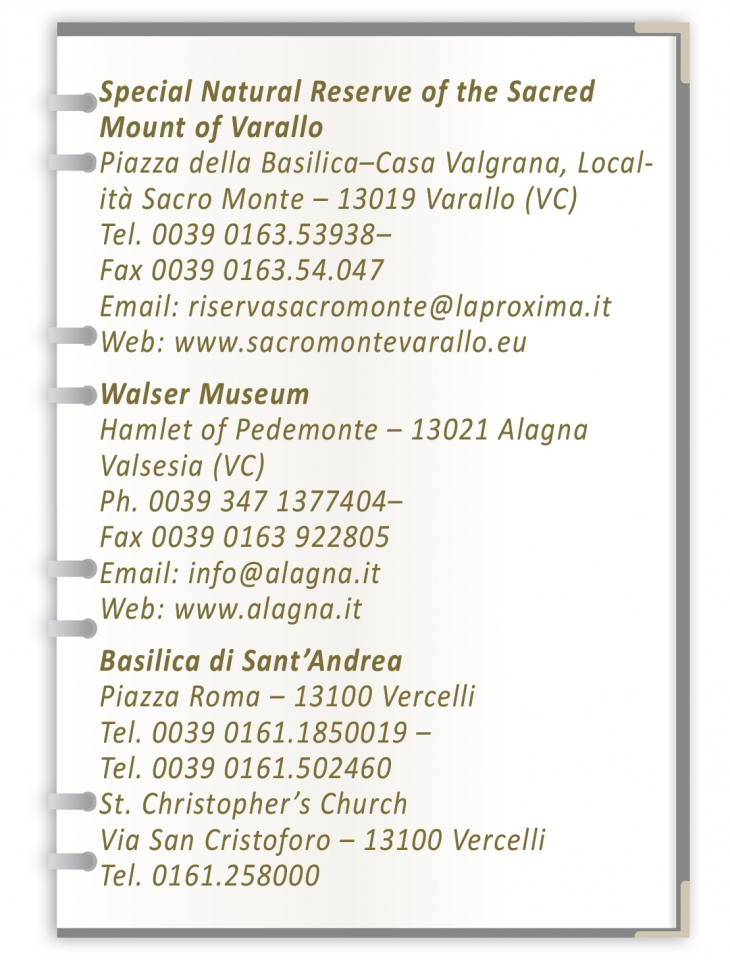 The monumental complex of the Sacred Mount rises on a rocky peak which dominates Varallo and offers very atmospheric glimpses of the town below and of the entire Valsesia district and Monte Rosa. Tourists can reach the top of the mountain by a cable car. The mount is an integrated part of a Special Natural Reserve and is the oldest of the Sacred Mounts in Italy.