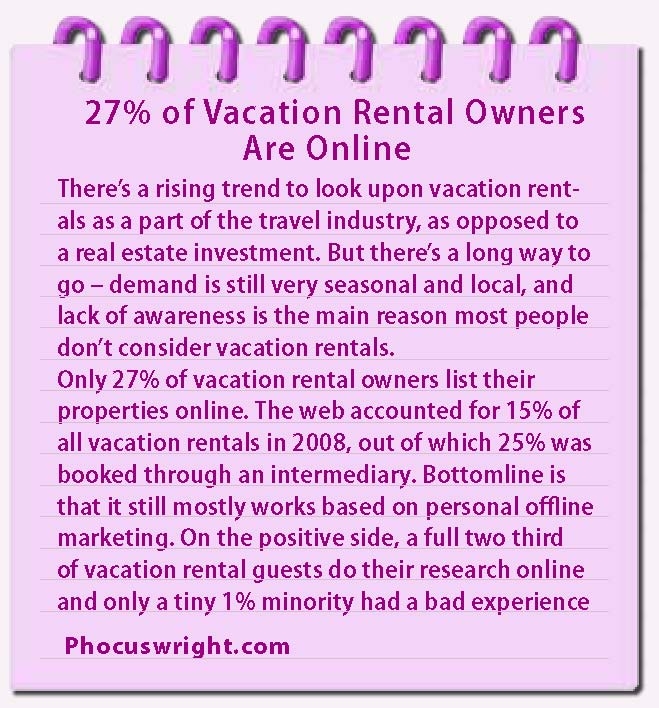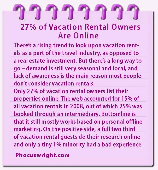 PhoCusWright also asked previous vacation rental guests who did not consider vacation rentals for their last leisure trip what were their reasons for not booking a vacation rental. Only 1% indicated a previous negative experience with vacation rentals as the reason.
