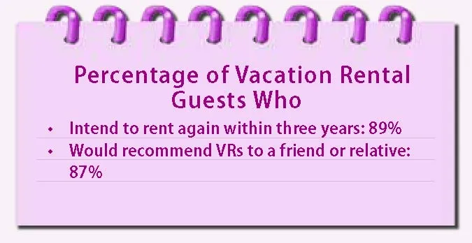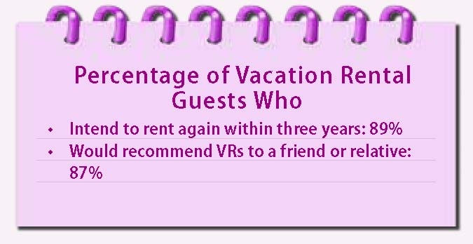 But despite the consumer travel media coverage of those negative experiences with vacation rentals, PhoCusWright research clearly indicates that such occurrences are outliers. In fact, vacation rental guests are extremely satisfied. According to PhoCusWright's Vacation Rental Marketplace: Poised for Change, a landmark study of the industry, nine in 10 vacation rental guests intend to rent again within three years and would recommend to a family member or friend.