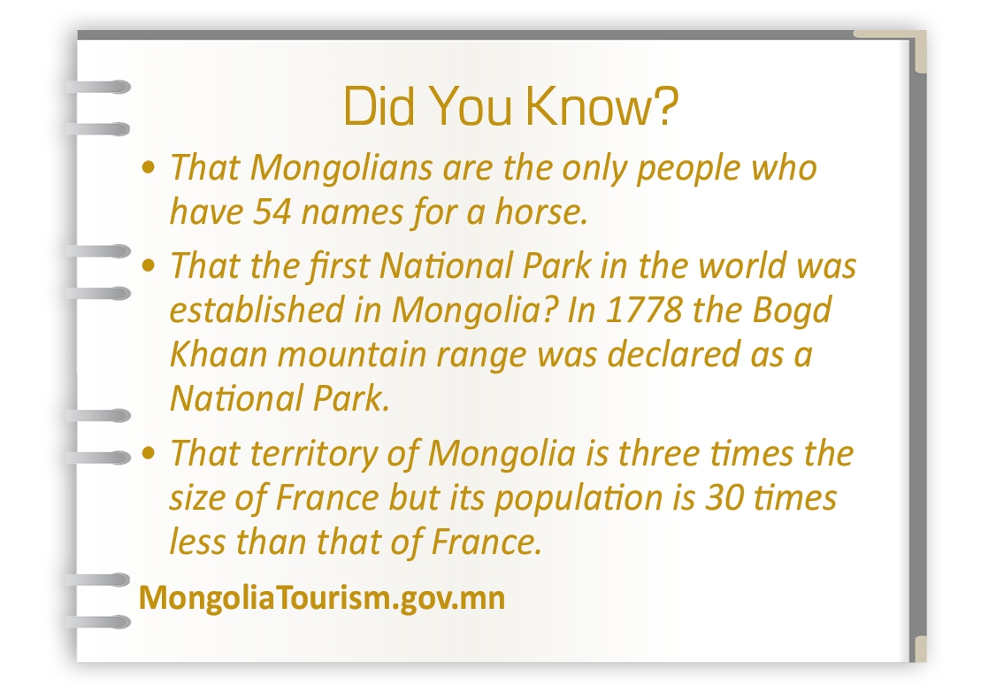 A half of its 2.5 million inhabitants still preserve a nomadic lifestyle, freely migrating in the steppes, mountains and deserts and living on livestock breeding and natural resources, following thousand-year-old traditions. Although "urbanized", the other half never loses an occasion to adventure into the infinite steppes both for pleasure and necessity.