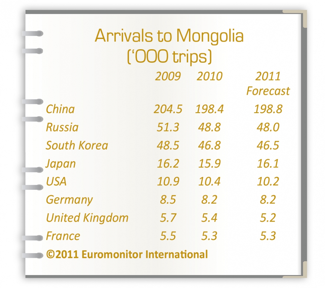 The number of outbound travelers, which is underdeveloped, fell significantly as Mongolian consumers stayed at home. With holidaying still considered a luxury, Mongolian consumers were further discouraged by weakened purchasing power, persistent inflationary pressure and a lower exchange rate, and as a result, travelling abroad was low on their list of priorities during 2010.