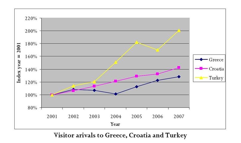 So Athens “bounced back” well from the Games, better than any of its immediate predecessors. But Greece, as a destination, has failed to keep pace with its leading competitors. The gradient of its growth has been significantly less than Turkey. But most of this comparative failure took place before the Games. The games themselves marked a nadir in demand, from which Greece has recovered to almost match Croatia’s growth.
