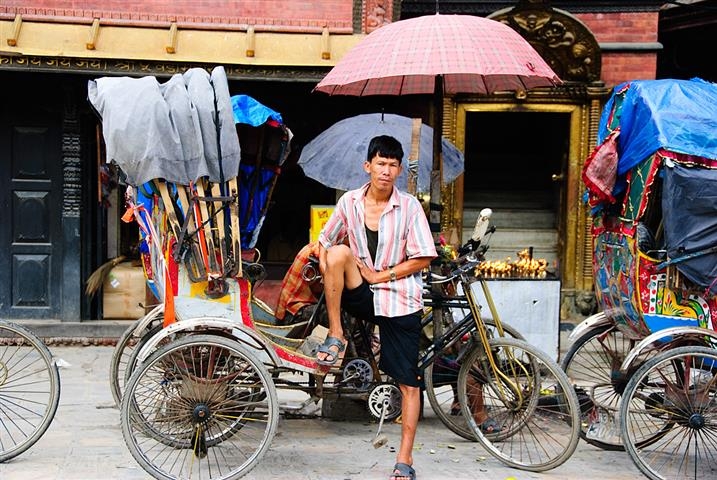 The cycle rickshaw is common through Asia as a means of local transport. Nepal has its own unique style of rickshaw which resembles a kind of Jinka attached to the back of a sturdy framed India bicycle. These two seated contraptions are all adored with a colourful canopy, images of the various Hindu gods, loud comical sounding horns, normally made from plastic bottles and propelled along by the skinny, yet deceivingly powerful legs of a Nepalese Driver.