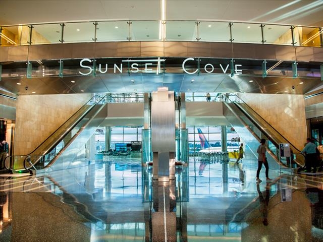 The new terminal building included in this project is called Sunset Cove. It houses many different vendors, including Pannikin Coffee & Tea, Stone Brewing Co. and Phil’s BBQ. The building will also include an entertainment stage, wine bar and two spa centers.