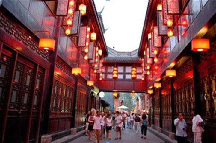 The green flagstones-paved lane that extends for about 350 meters from the imposing archway at the end of the street engraved with 'Jinli Street' on it has tea houses, hotels and stores on both sides. The buildings are modeled to resemble the architecture of a western Sichuan old town from the Qing Dynasty (1911 B.C. to 1644 B.C.) by combining the Three Kingdoms Period culture and the Sichuan folk customs. The brick walls and wooden steles display an ancient charm.