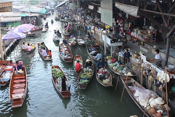 Among Thailand’s most popular markets is Damnoen Saduak, a famous and largest floating market in Ratchaburi which is about an hour and a half drive from Bangkok. Floating markets here are seen every day. At weekends this place is flooded both by the locals and tourists. If you want to avoid the overflowing crowds, go there before 9 am because travelers on an organized trip visit Damneon Saduak by this time. With its picturesque waterways and busy vendors on boats, photographers won't run out of subjects to shot. Damneon Saduak is also a great place to buy souvenirs since many souvenir shops can be found just around the marketplace.