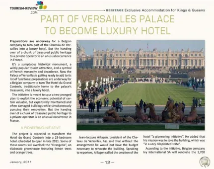 Natural disasters and the ability of travel companies to join forces in critical situations – this is the theme of the Ethical supplement. Let’s have a look at the effects of tsunami, volcano eruption or torrential rains on the travel world. If you prefer a more peaceful topic go for Bulgaria and its tasty cuisine, sunny beaches and lovely countryside. Read more in the Destination part. First of all however open the Heritage supplement presenting several high level hotels that have been lucky enough to welcome several presidents and other celebrities in their facility. Enjoy the January magazine.