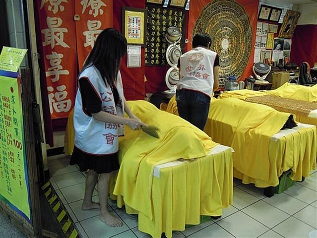 At Pan's parlor in Taipei's Sungkiang Road, Taiwan, the light pitter-patter of the knife patting the body is mingled with the conversation between the four masseurs and their customers. Some scream for pain when their very sore spots are patted, but most others, like stay-home mother Huang Chia-chen treated for insomnia, fall asleep during their sessions.