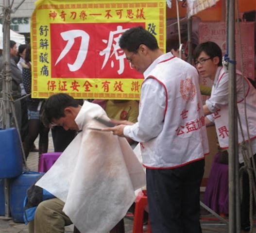 Pan admits that most customers, although drawn to the mysterious knife massage healing, tend to be nervous before their first session. So he usually has to give a brief demonstration on himself.