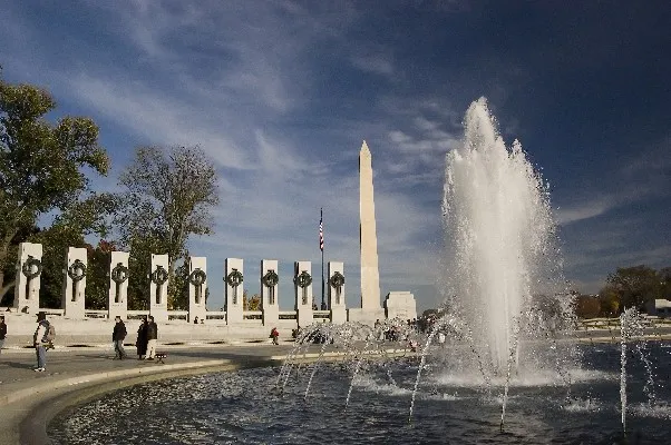 Located in Washington, DC, this is one of the country's newest memorials to honor the men and women who served in the United States Armed Forces and the over four hundred thousand who died. It also honors the people back home who helped by supporting the war effort. The Washington and Lincoln Monuments flank this shrine which is open twenty-four hours daily. Its fountain and plaza are surrounded by a semi-circle of fifty-six pillars and triumphal arches. To the west of the memorial is a wall with the dedication that reminds visitors the price of freedom.