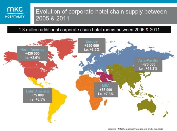Between 2005 and 2011, there was an injection of 1.3 million chain hotel room around the world. Most growth came in the Asia-Pacific region, with an increase of 11.2%, followed by the Middle East & Africa at 7.3% and then Latin America 6.5%. Europe’s chain supply increased by 3.5% and the North America 2.6%.
